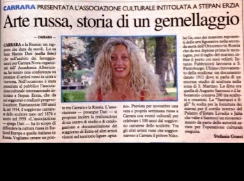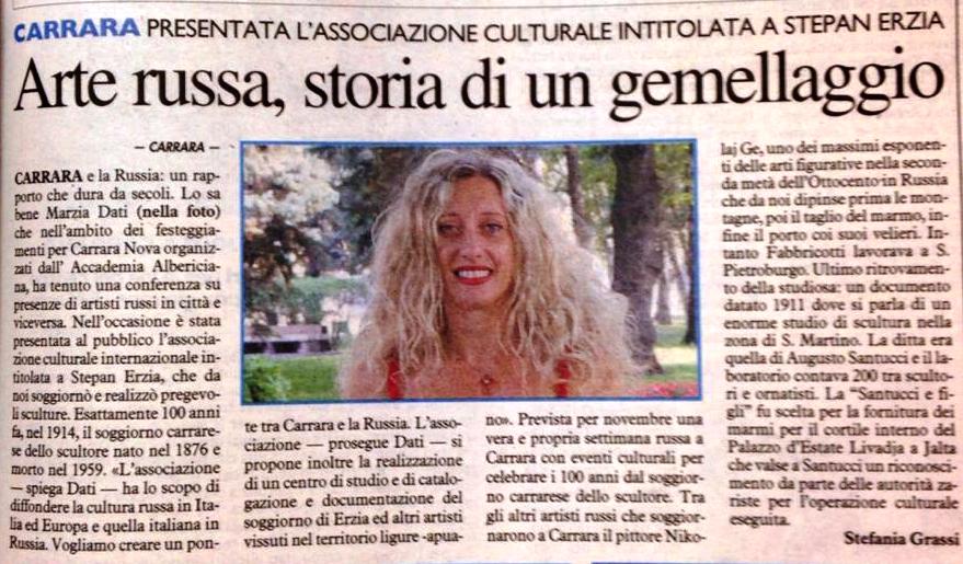 21 мая в Карраре в центральной библиотеке в рамках фестиваля искусств, организованного Академией Альберичана, прошла первая презентация Ассоциации международного культурного сотрудничества (ACISE), которую провела вице-президент Марция Дати. Она рассказала о программах и проектах культурного сотрудничества между Россией, Италией и другими странами Европы, которые будут реализованы сотрудниками Ачизе в ближайшие годы. Выступление М.Дати вызвало большой интерес всех присутствующих и нашло отражение в прессе (см. статья в газете La Nazione»)