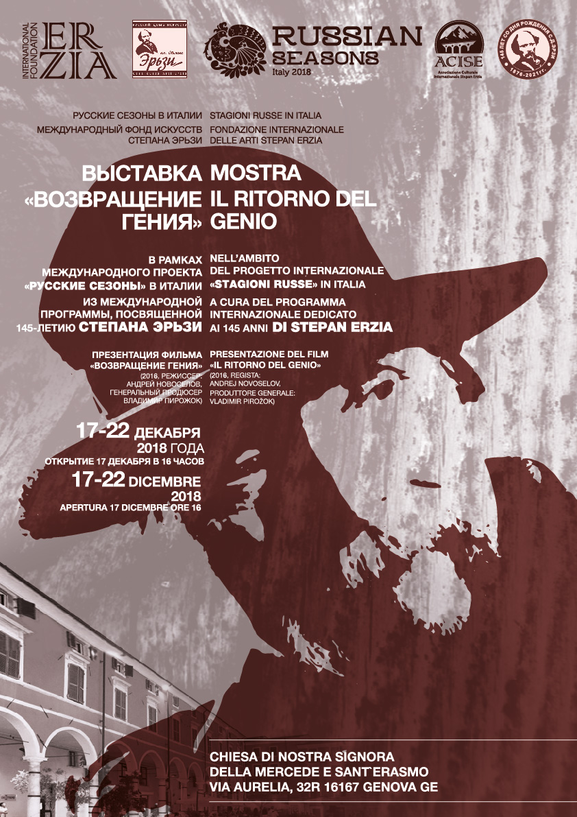 La mostra si terrà dal 17 dicembre al 22 dicembre, sarà presentata una nuova esposizione delle opere del grande scultore russo in Europa. Alla mostra "Il ritorno del genio", tenutasi alla Chiesa di Nostra Signora della Mercede e Sant'Erasmo (Genova), è esposta la collezione di sculture del Fondo internazionale per le arti intitolata a S. D. Er'zia, che propone di conoscere le opere uniche del maestro provenienti da collezioni straniere, in precedenza sconosciute al pubblico. "